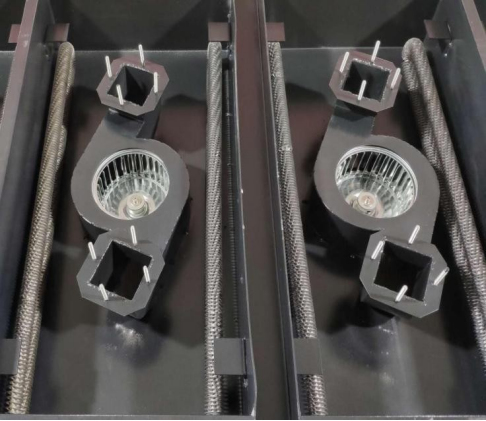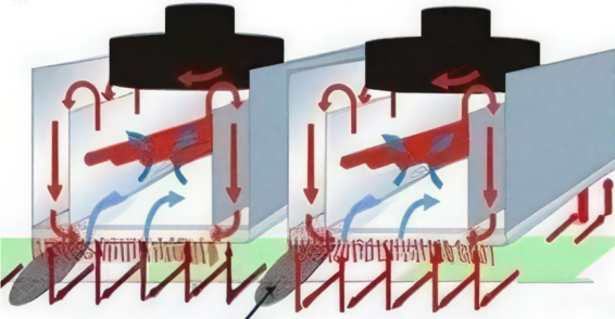 色多多网站自行研發熱風循環色多多视频在线,通過高溫馬達+風葉吹風,使發熱管加熱變為熱風,側位回風形成循環,熱風結構熱傳遞效率顯著提升(30–50W/m²K),消除了陰影效應和顏色對吸熱的影響,成為當時主流色多多视频在线。