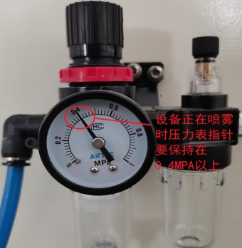 解決辦法:檢查外部供氣氣壓必須在開啟噴霧時保持≥0.4MPA以上,同時可以調節氣缸壓力減壓閥,偏低時氣壓太低無法推動氣缸。管道彎折導致氣缸無法移動需要檢查所有管道有無折彎角度過大,校正管道