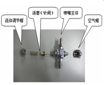 助焊劑噴頭主要包括噴霧造型帽、噴嘴主體部分、活塞(頂針)、頂針彈簧、流量調節螺母(噴頭底蓋)、幾大塊組成。